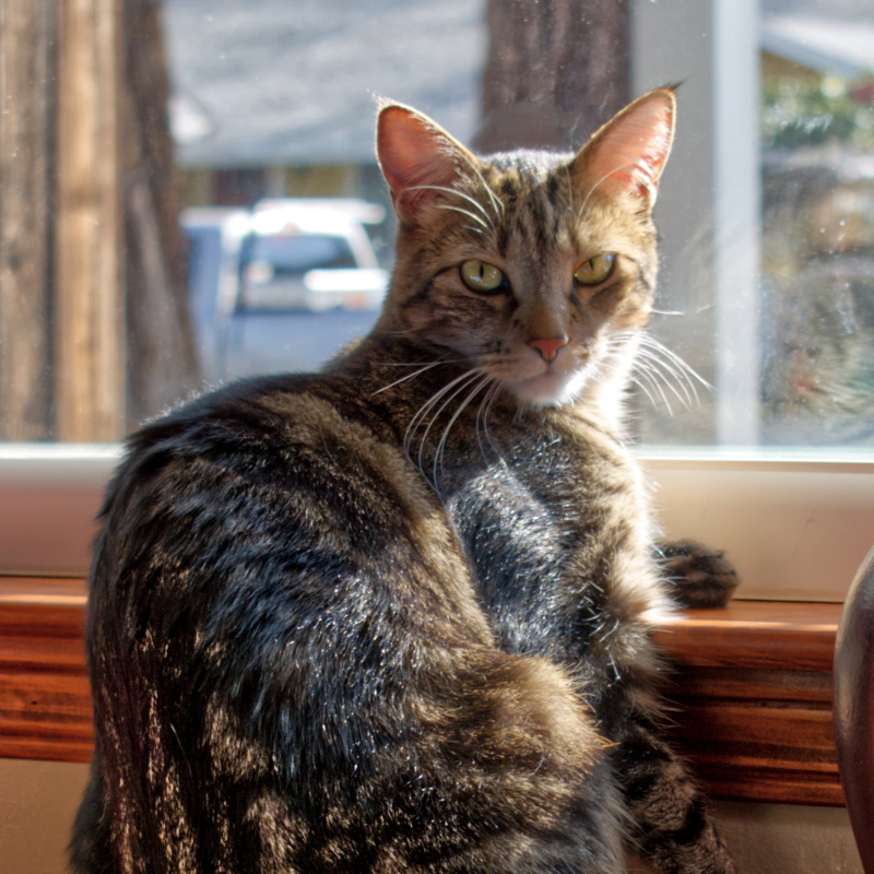 I am named after the Brazilian dance, Samba, and even though I am the life of the party, I have always been grounded and present for my brother, Pawso. We had a rough start as kittens. He depended on me when our mom was not around. I taught Pawso many of his life skills. Being a big sister stresses me out, and Pawso gets on my nerves because he always wants to play and have my attention. However, I balance my stress by making sure I take daily “alone” time to slow down and enjoy a quiet relaxing nap in the sun. My favorite activity is running on my cat wheel. Exercise is so energizing!